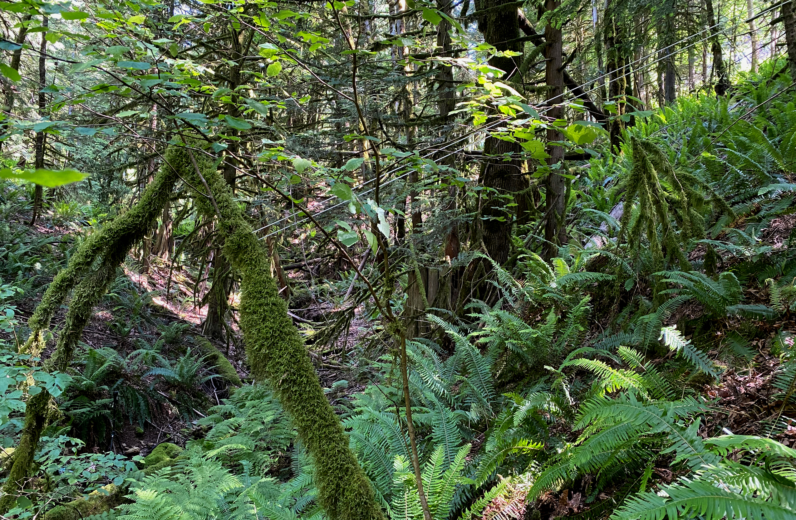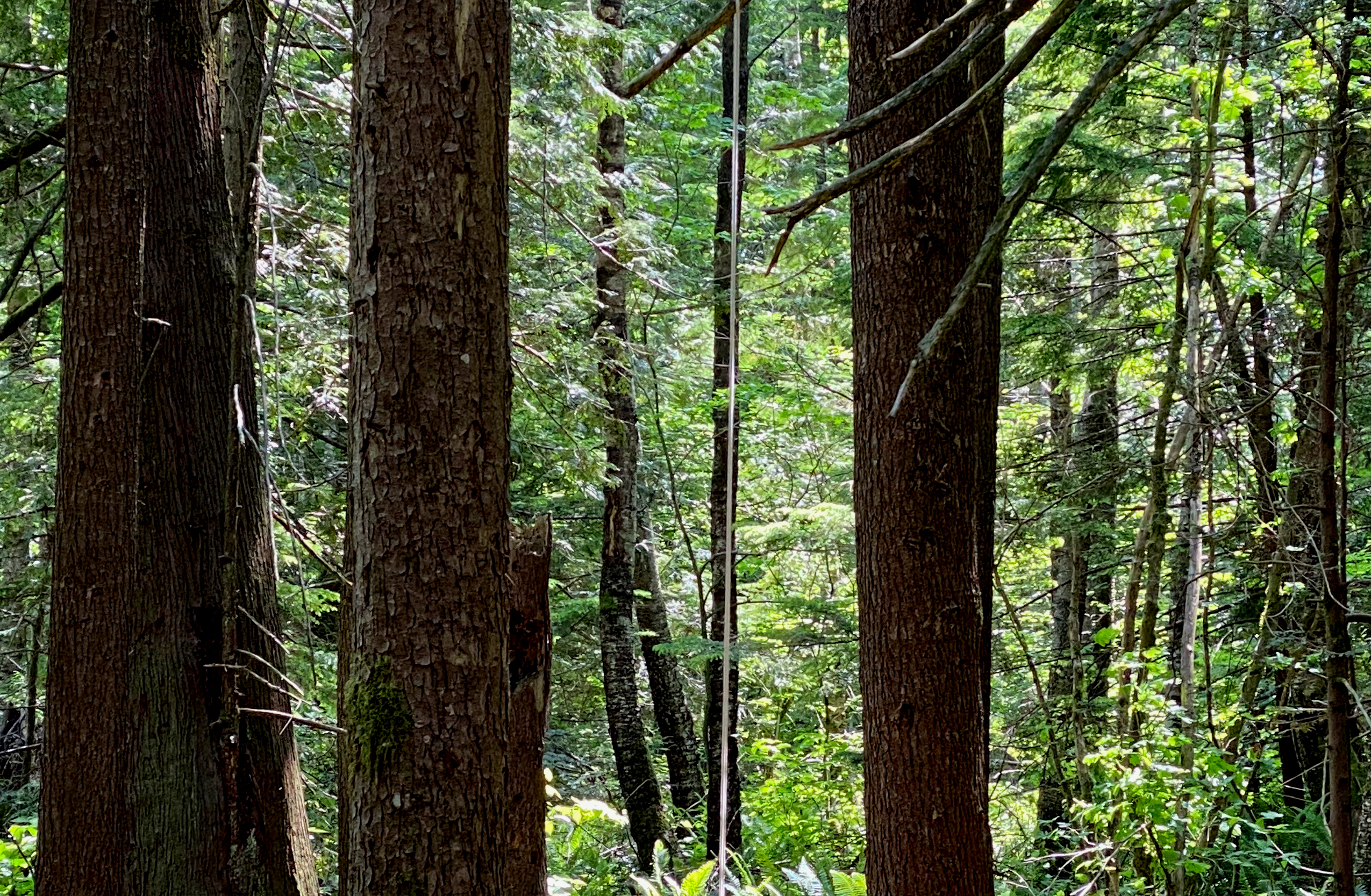 Several Forest Markings were installed at key locations in the village and its surrounding Coastal Western Hemlock forest. These “drawings” in three-dimensions combine academic ecological studies with primary experience in the forest and intertwine two interpretations of the word. First, they draw—or abstract—their order from the positions of the trees on the sites; and second, they engage the forest with taut lines of string that resemble lines drawn on paper. Although the approach is consistent, the dimensions and configurations of the strings respond to the shape, arrangement, and spacing of trees, and their branches and stumps.